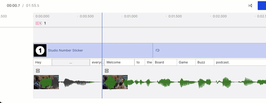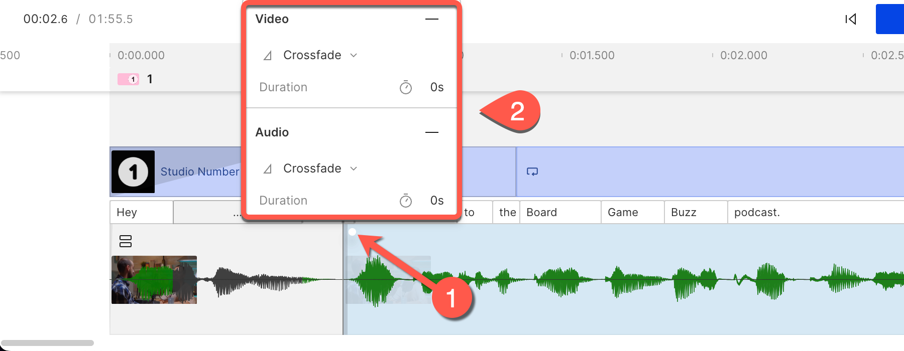 With Descript, you can apply fade-ins and fade-outs on clips in the Timeline, as well as create crossfades between adjacent clips within a single layer.
