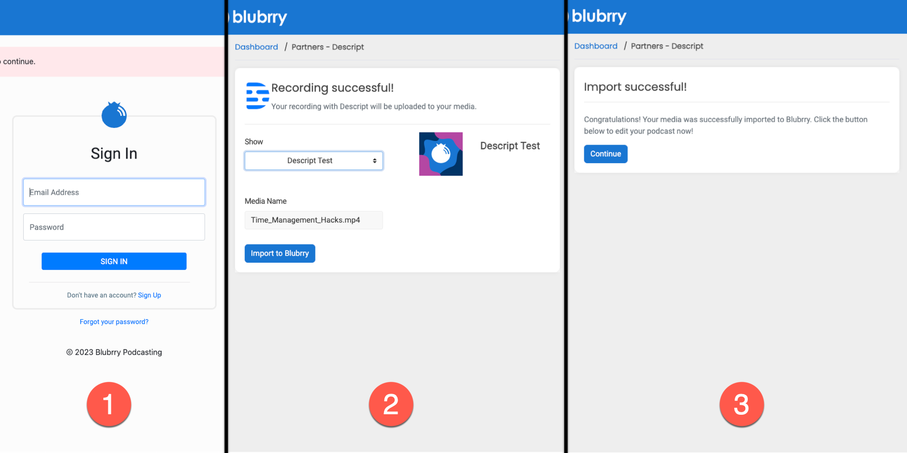 - Sign in to your Blubbry account or sign up for a new account. At that point, your Descript content will begin uploading to your Blubrry media.