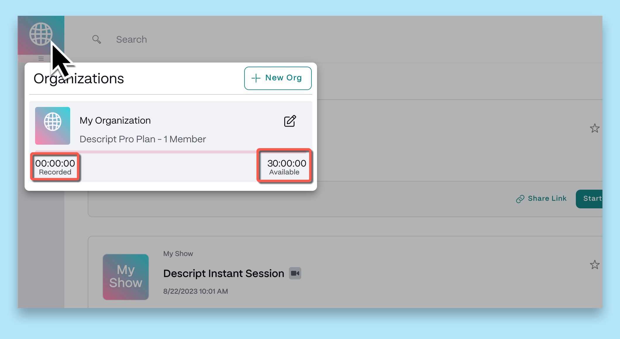 - Once you are signed in, click your organization's icon in the top left corner to see your recording hours.