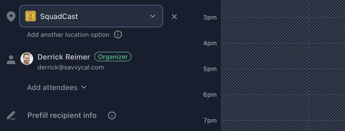 Once you've completed the steps above, you can set your scheduling links to use SquadCast as the location for your meeting and event.