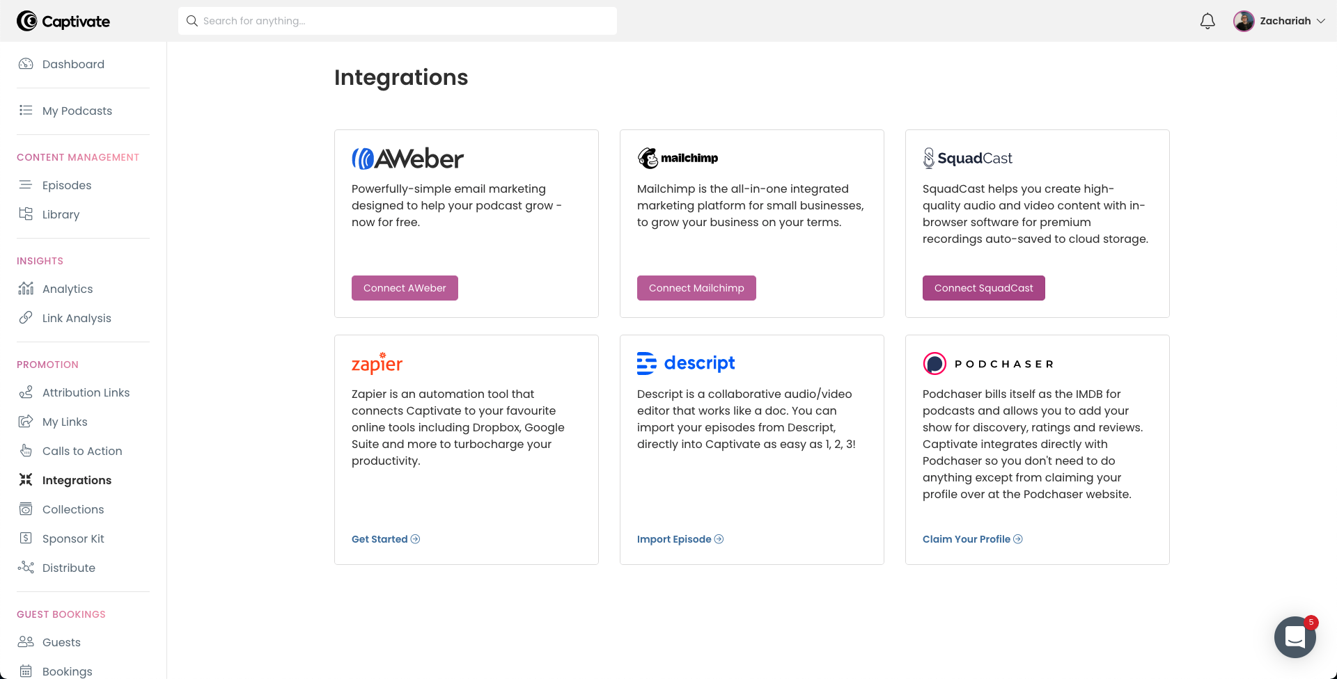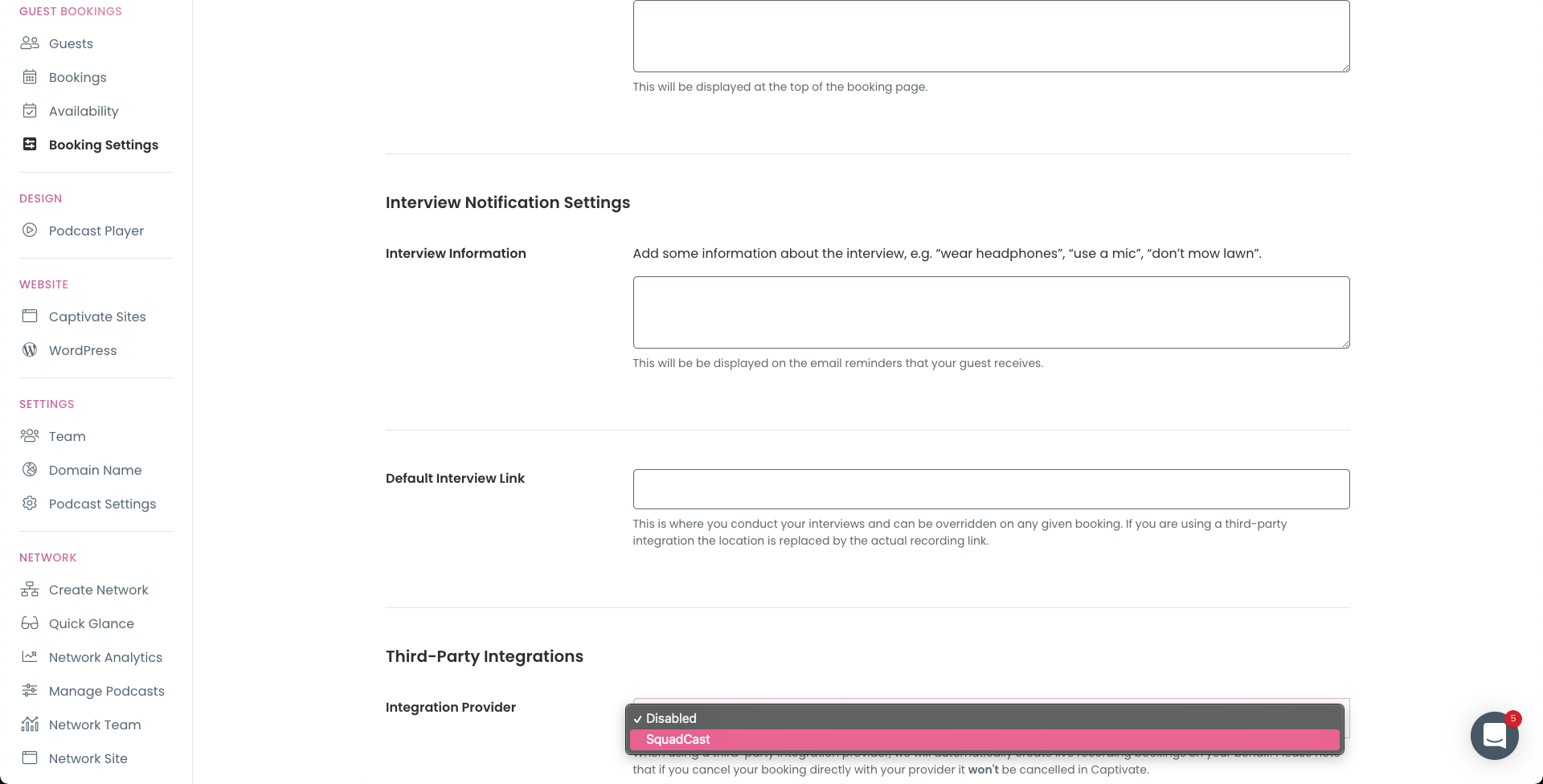 You can connect SquadCast with guest booking on Captivate! Captivate's integration allows you to connect to SquadCast so that you are able to book on Captivate and record on SquadCast. When your guest books with you on Captivate, the integration will automatically set up a new recording session on SquadCast for you to connect and record when the time comes. Setting up the integration is easy.