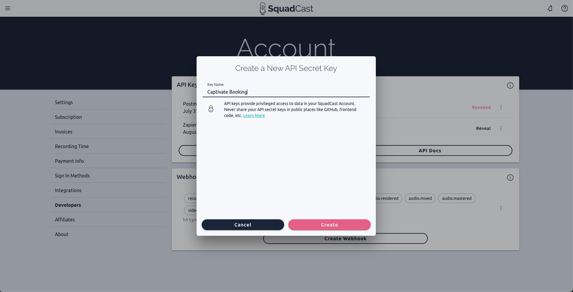 Create a new API Secret Key within your SquadCast Account Settings. We recommend the name "Captivate Booking."
