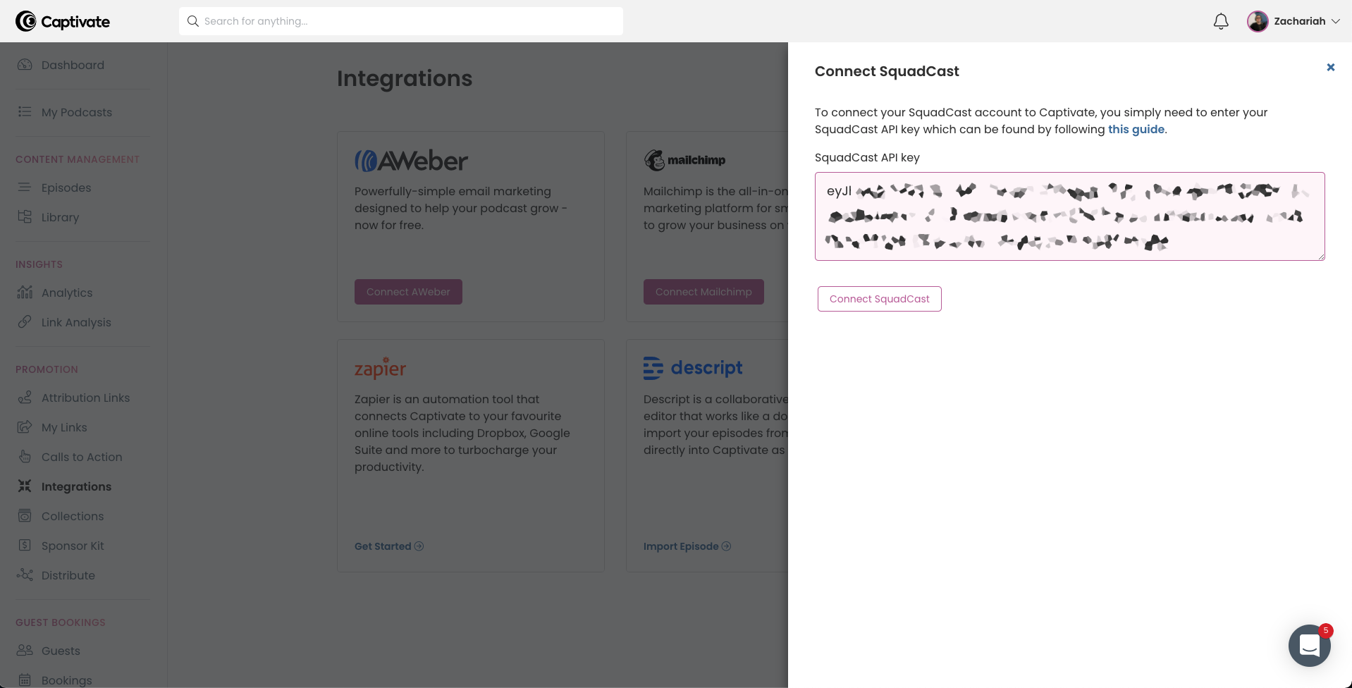 - Paste the new API Key into the SquadCast API Key field.