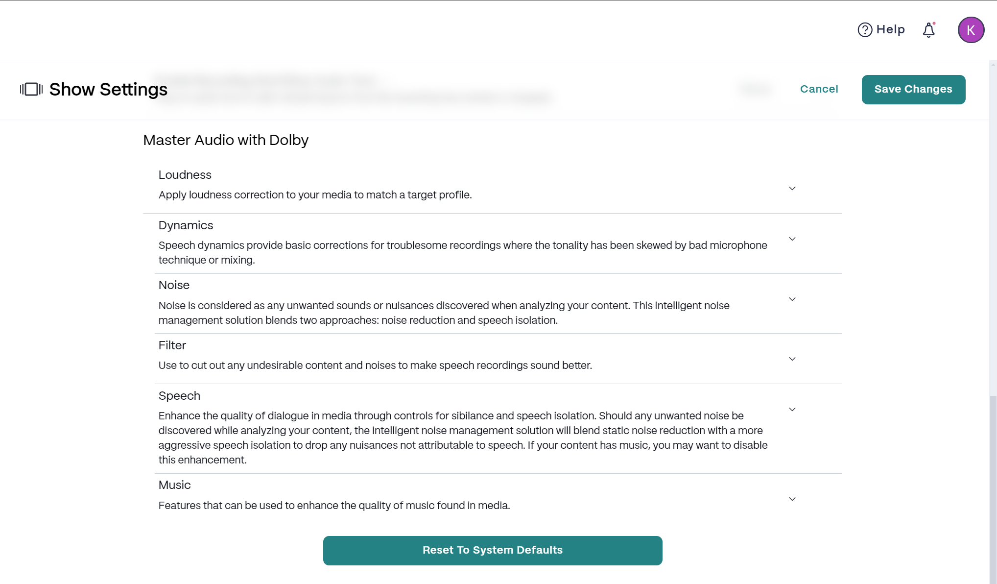 - Scroll down to the Master Audio with Dolby section. From here you can expand each section to make any needed changes.