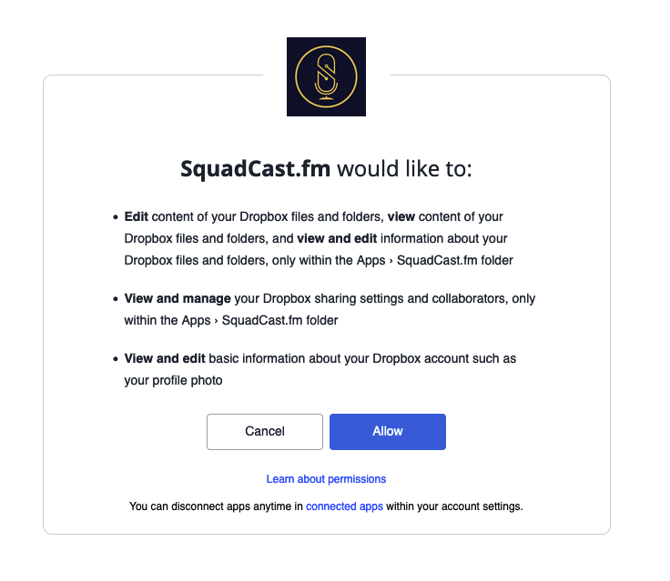 - After this you will be redirected back to SquadCast and your Dropbox account will be linked.