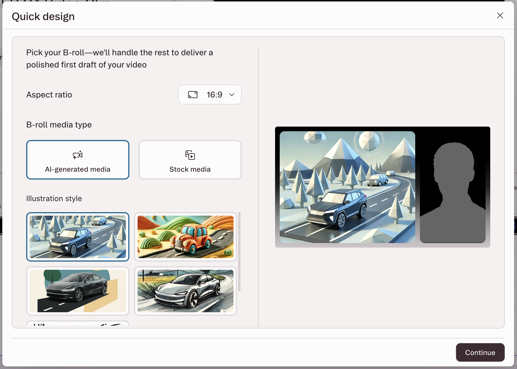- Choose whether to include B-roll. If enabled, Quick design will add supporting visuals using stock or AI-generated media.