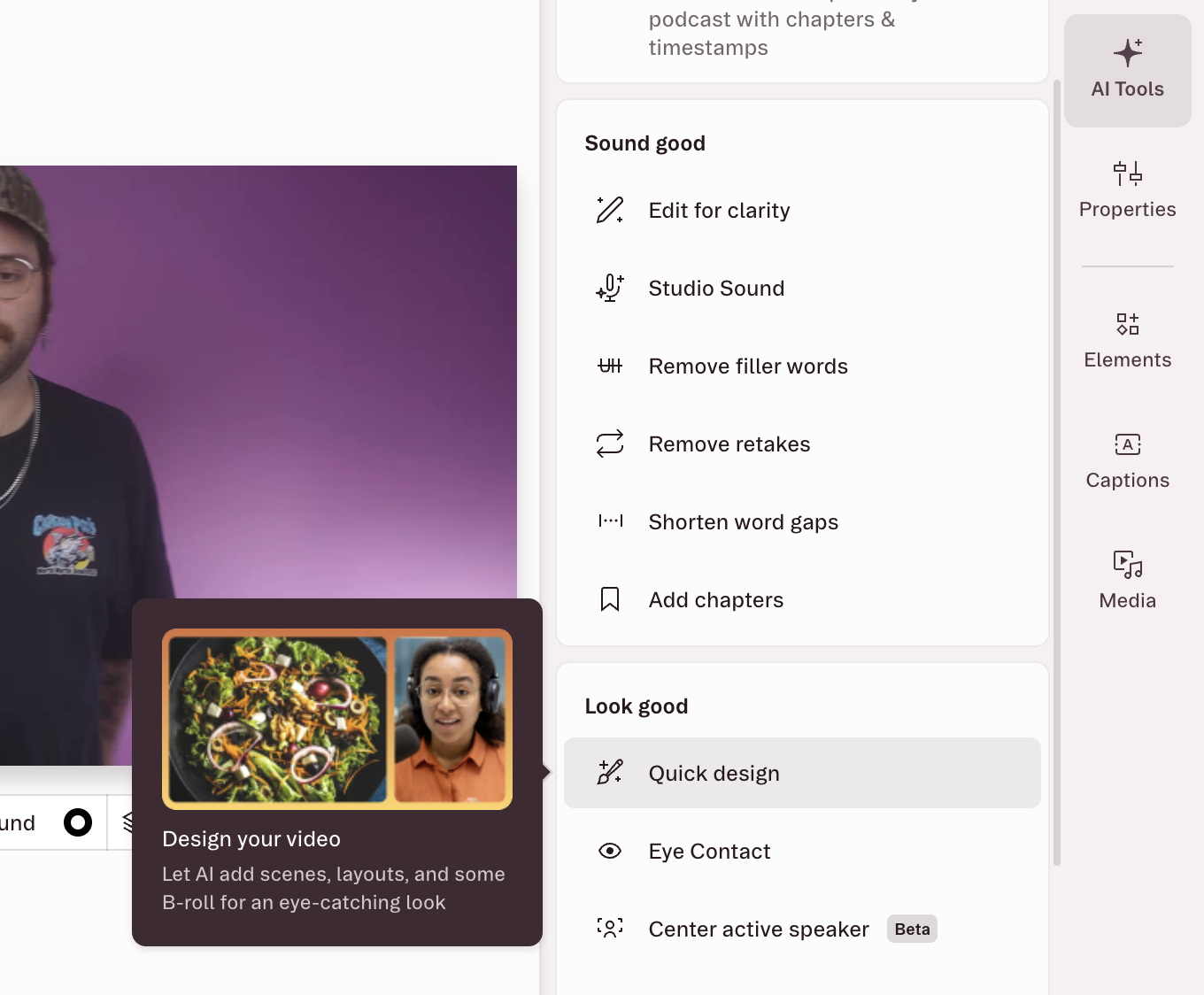 Quick design uses AI to turn your script or transcript into a more produced-looking video β breaking content into scenes, applying layouts and styling, and optionally pulling in B-roll. Use it when the goal is a solid starting point you can polish.